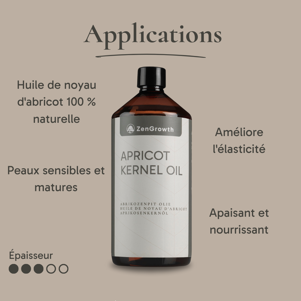 L'huile de noyau d'abricot ZenGrowth est une huile de massage légère et douce pour la peau. Elle pénètre rapidement sans laisser de film gras. Sa texture fine et légère est parfaitement absorbée par la peau et procure une sensation de douceur exceptionnelle, idéale pour les clients et les massothérapeutes qui trouvent souvent les huiles de massage trop grasses. C'est pourquoi nous la recommandons pour les massages du visage !