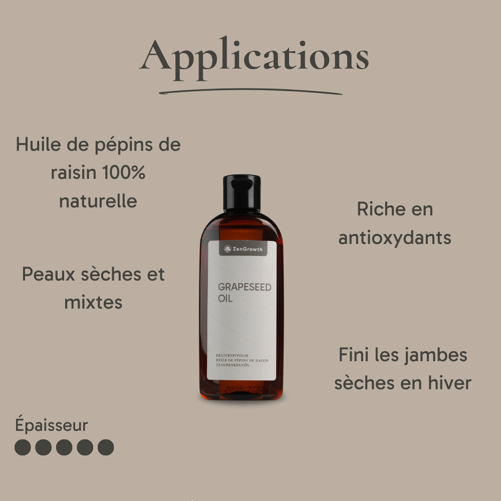 Cette huile convient parfaitement à la fois à la peau et aux cheveux. Comme l'huile d'amande, elle offre une bonne viscosité qui permet une absorption optimale sans laisser de film gras. L'huile de pépins de raisin de ZenGrowth est produite à Nîmes, dans le sud de la France, à partir de pépins issus de la production viticole, réduisant ainsi le gaspillage des ressources.