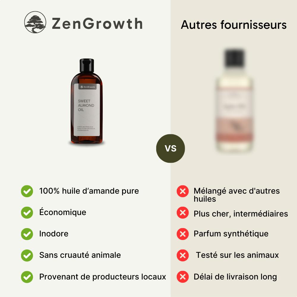 L’huile d’amande douce ZenGrowth est une huile douce et nourrissante qui glisse agréablement sur la peau sans pénétrer trop rapidement. Elle est idéale pour les massages de relaxation, les massages classiques ou suédois, ainsi que pour l’aromathérapie. Grâce à sa composition douce, elle convient également aux peaux sensibles et aux massages du visage. Il n’est pas étonnant qu’il s’agisse de l’huile de massage la plus vendue de notre assortiment !