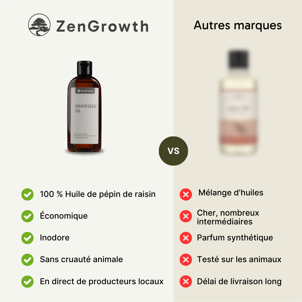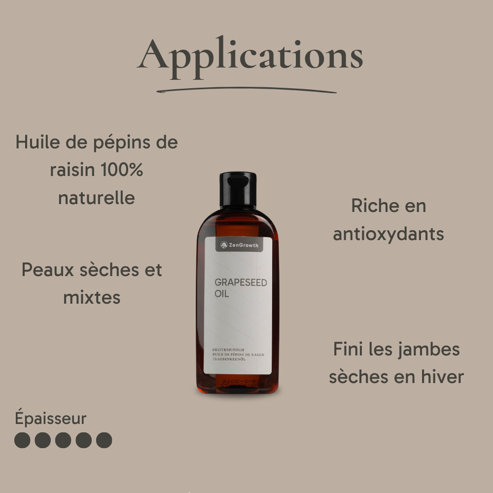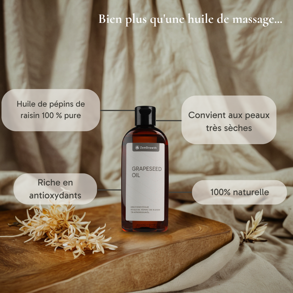 L’huile de pépins de raisin ZenGrowth est l’un des produits connaissant la plus forte croissance au sein de notre assortiment. Il s’agit d’une huile de massage légèrement plus épaisse et inodore, qui glisse agréablement sur la peau et pénètre un peu moins rapidement que nos autres huiles de base. Elle est idéale pour les massages sportifs, les massages deep tissue, le cupping ainsi que les massages de relaxation lorsque vous préférez travailler avec une huile plus consistante.